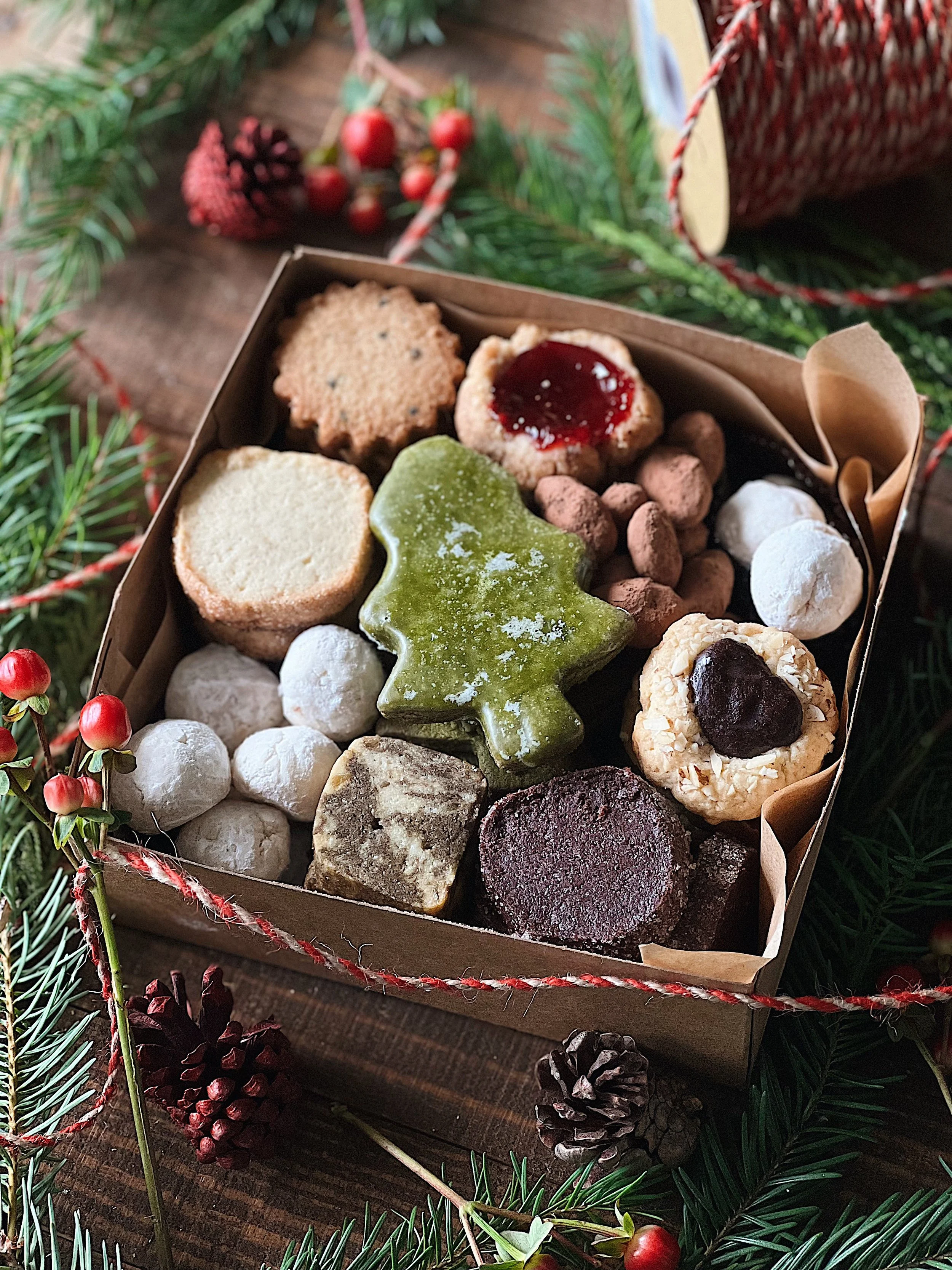 In each Holiday Cookie Box there is an assortment of 9 different types of cookies: